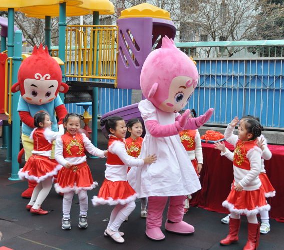 阴冷的天气却有浇不息的热情,绽放的笑容定格在这个温馨的开学日。MOMOKING和MOMOQUEEN也在这天带着欢笑来到了金尚小金星幼儿园,和小朋友开始度过这难忘的开学日。 当家长们牵着孩子来到了久违的校园,MOMOKING和MOMOQUEEN早已站在幼儿园门口欢迎他们的到来,小朋友们争先恐后的和两只可爱的人偶握手问好,原本寒风阵阵的早晨,因为他们的出现变得格外温暖。所有孩子入园以后,便是内容丰富的开学典礼活动,一曲热闹的《新年娃娃舞》让小朋友们拍手叫好,和蔼可亲的老师为小朋友们送上精心准备的新年礼物,而我们的MOMOKING和MOMOQUEEN也为大家献上了热情的舞蹈《你是我的朋友》,现场近500名小朋友在操场上和MOMOKING一起互动,活泼的MOMOKING也不放过“耍宝”的机会,不时逗得小朋友们哈哈大笑。 西游童话(MOMOKING)一直关注儿童的成长,希望把欢乐传递到每个小朋友的心里。